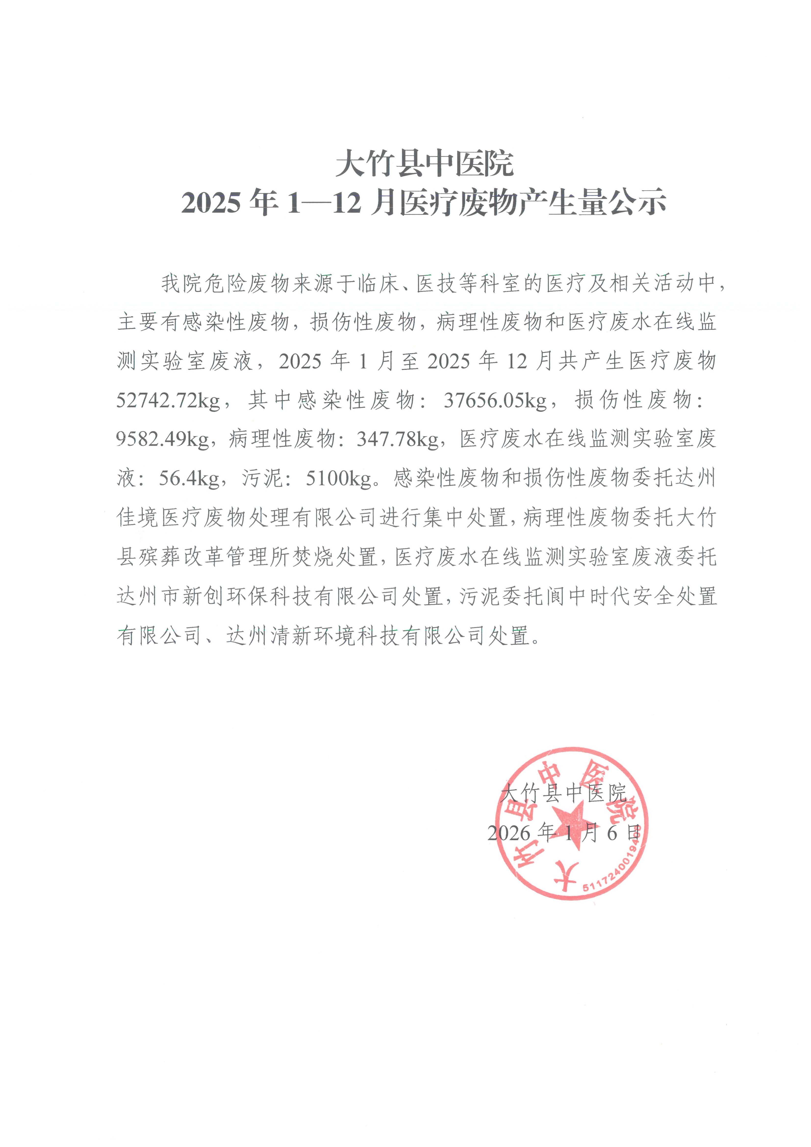 大竹县中医院 2025年1-12月医疗废物产生量公示