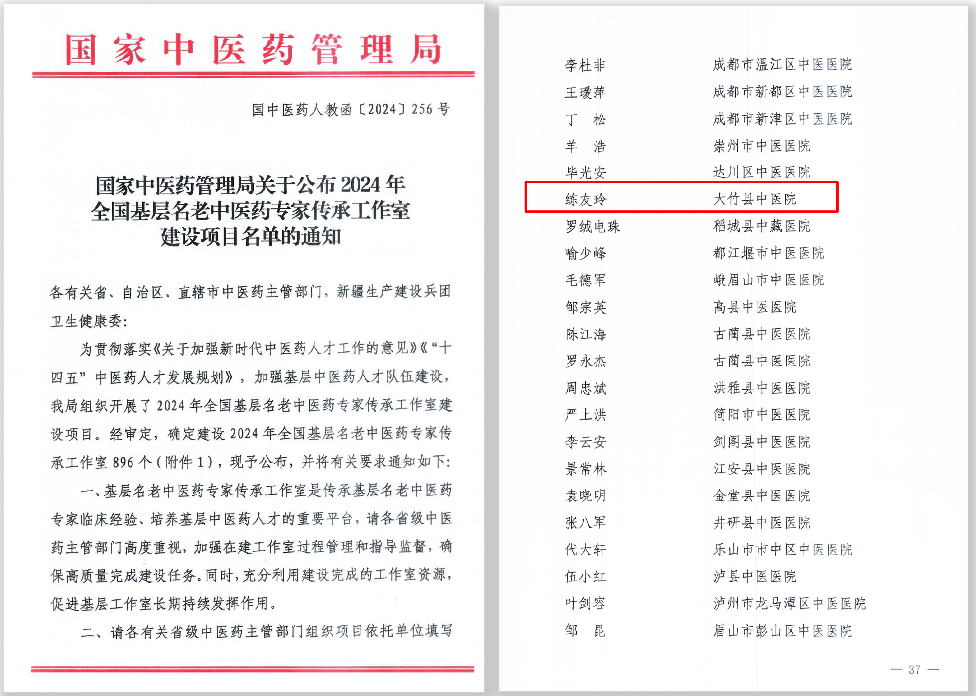 近日,国家中医药管理局公布了全国896名获批建设全国基层名老中医药专家传承工作室的专家名单,大竹县中医院练友玲榜上有名。